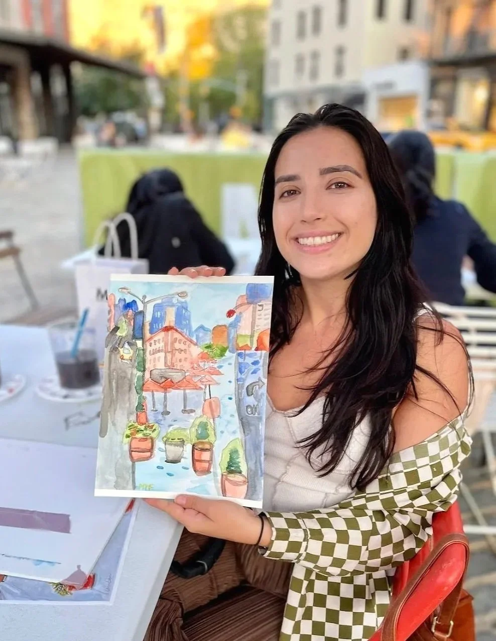 Watercolors on the Cobbles: An art class taught by Laura Baran en plein air for guests of the Meatpacking District in Gansevoort Plaza, NYC.