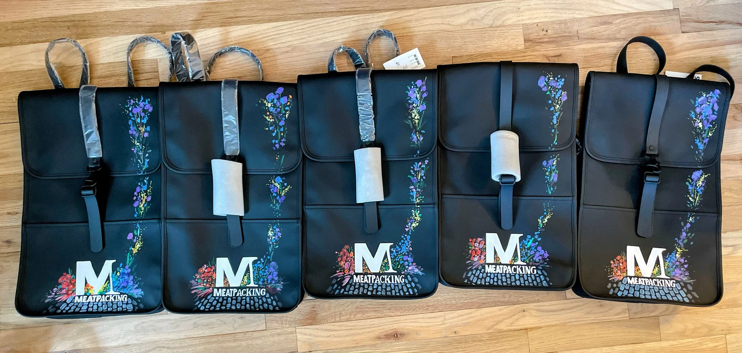 Hand-painted floral branded backpacks by Laura Baran for Meatpacking and LEAF Flower Show
