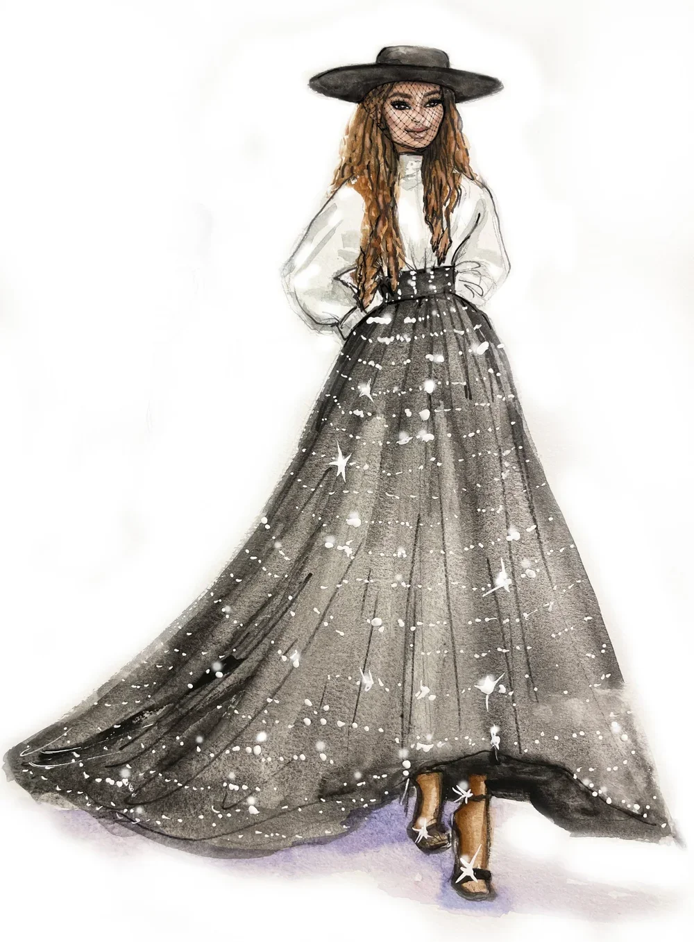 Sketch of Ava DuVernay in custom Monrowe hat for fashion styling visuals pre-Met Gala