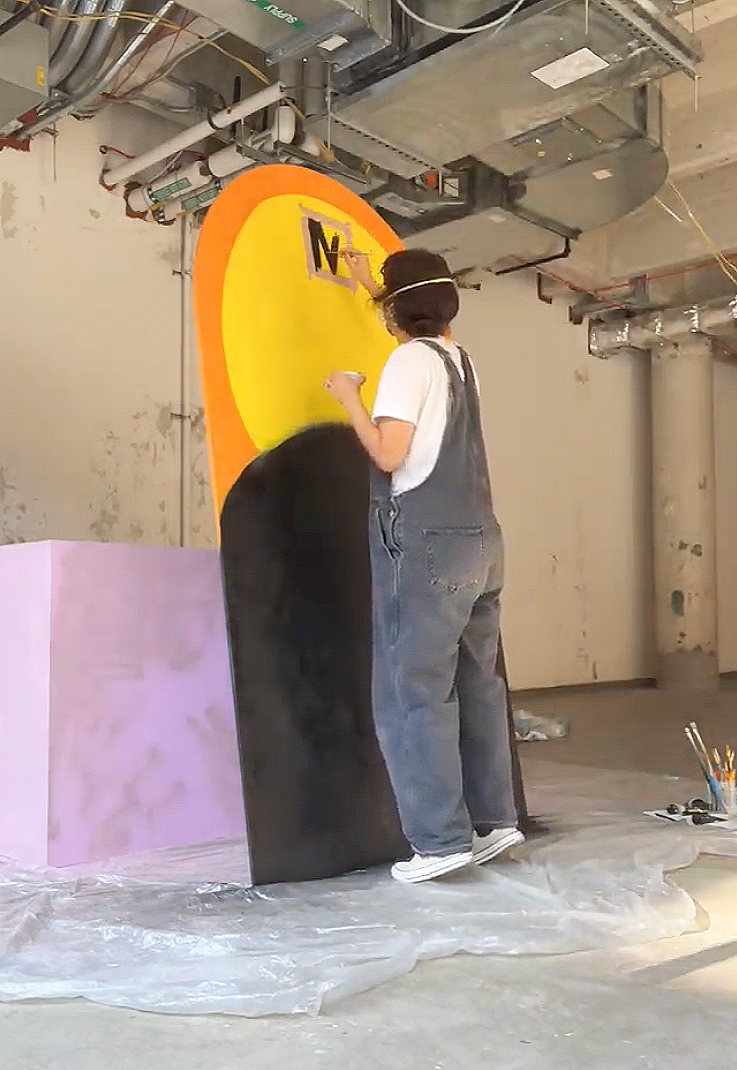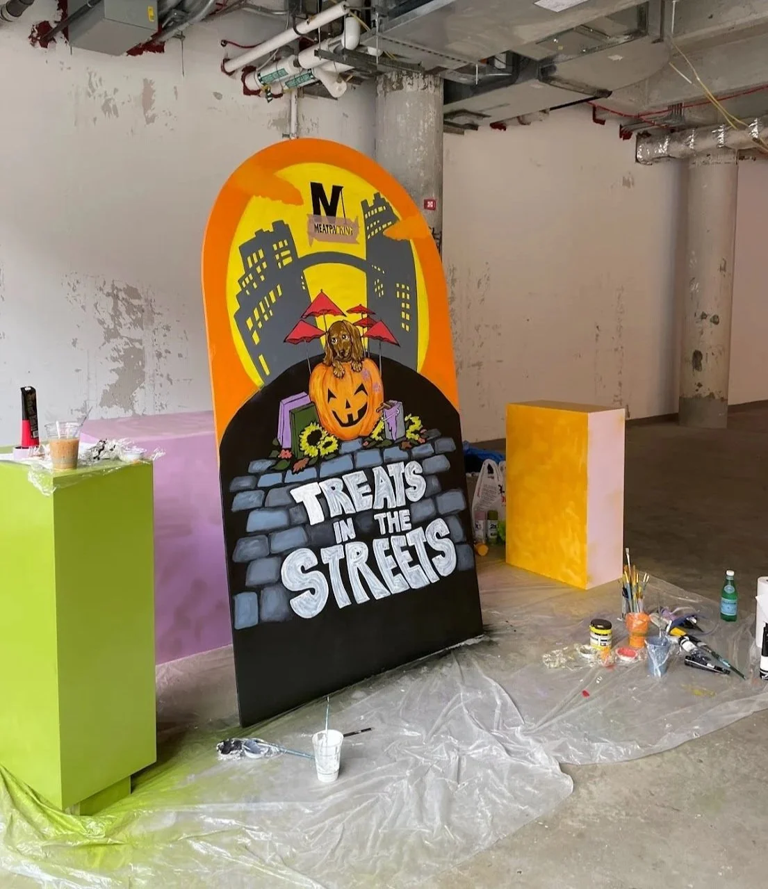 Laura Baran’s hand-painted, up-cycled wooden display murals for the Meatpacking District’s public event, Treats in the Streets, in NYC. October 2023