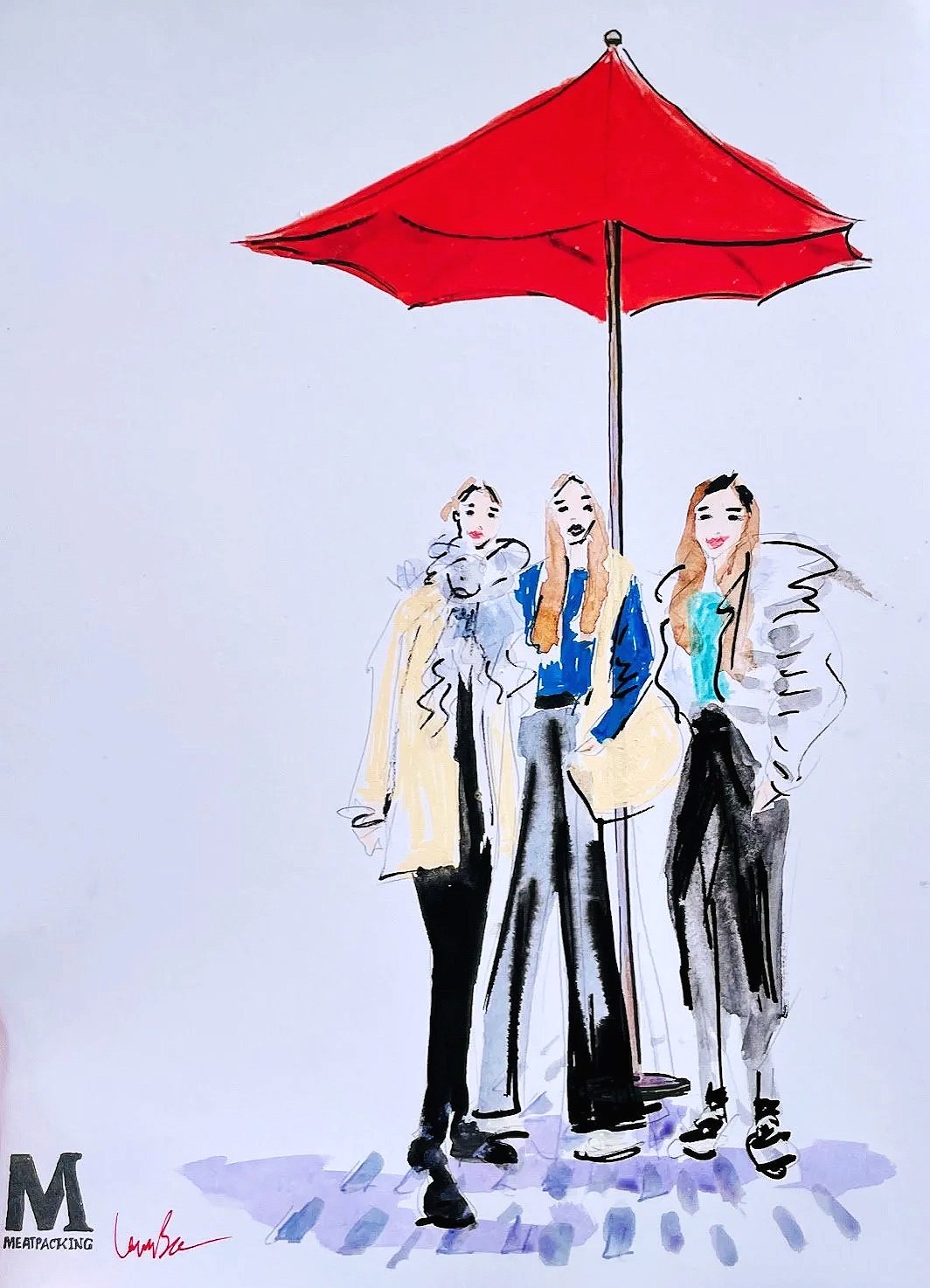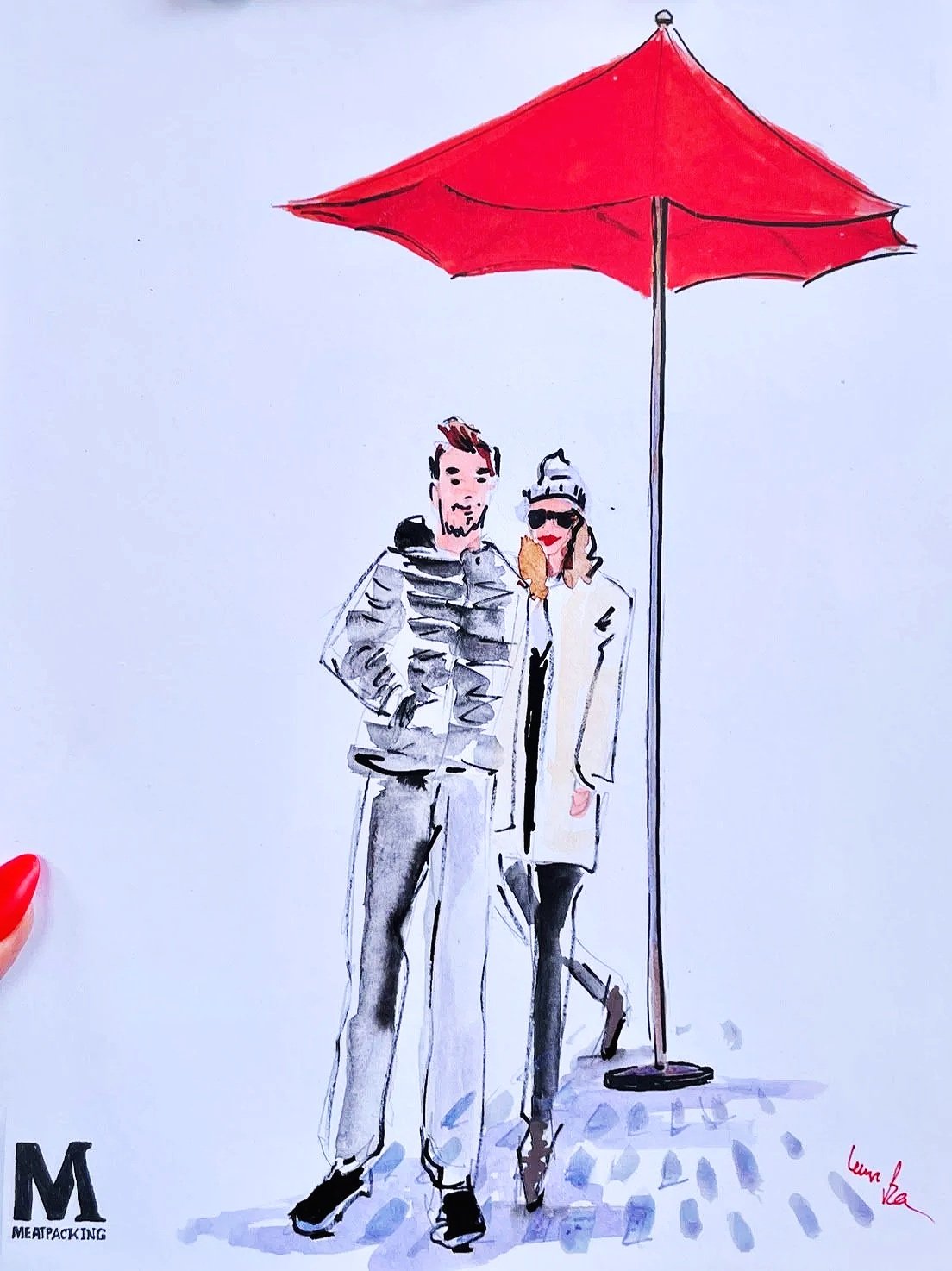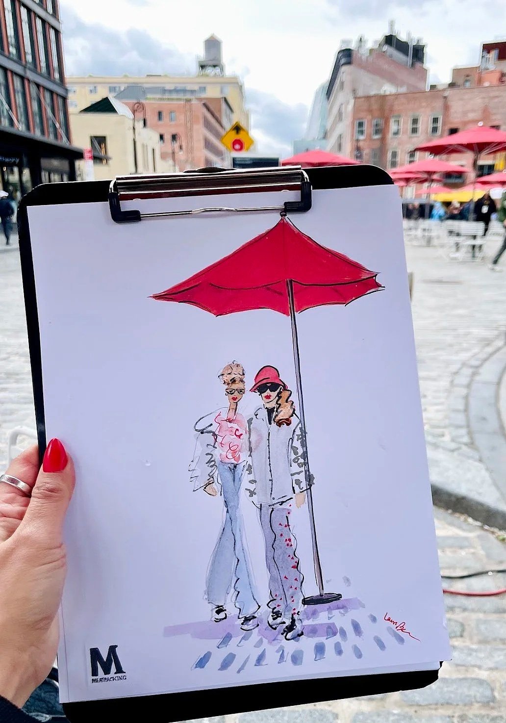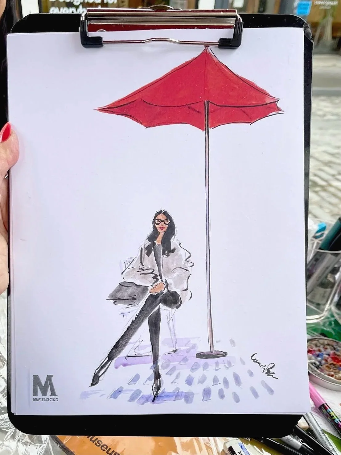 Live sketching fashion illustrations by Laura Baran at Meatpacking’s Return of the Red Umbrellas Event in Gansevoort Plaza, NYC.