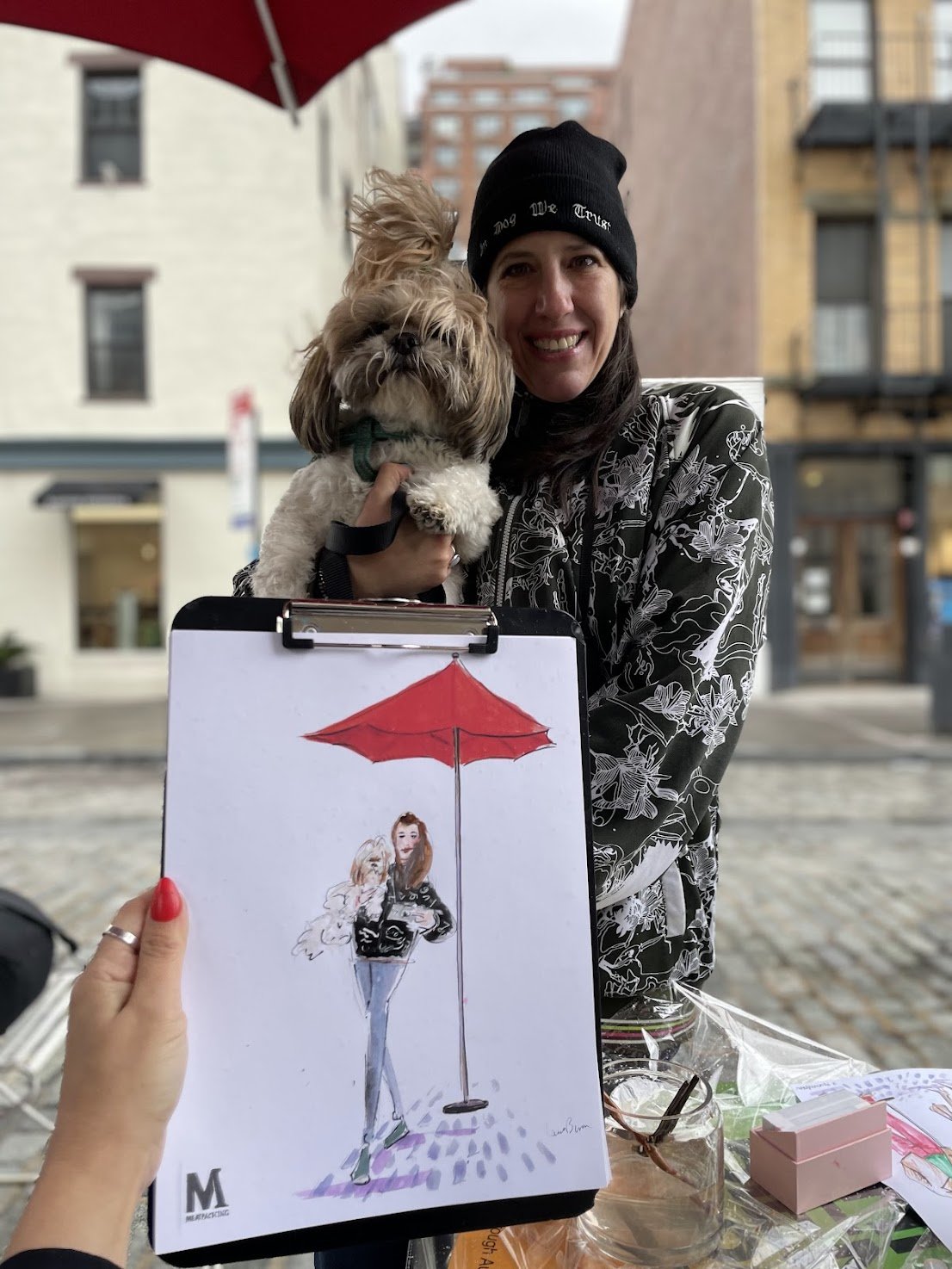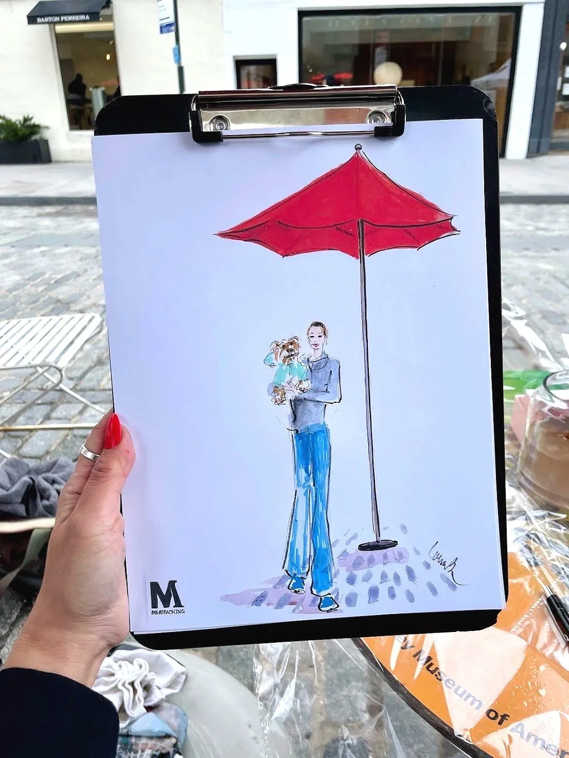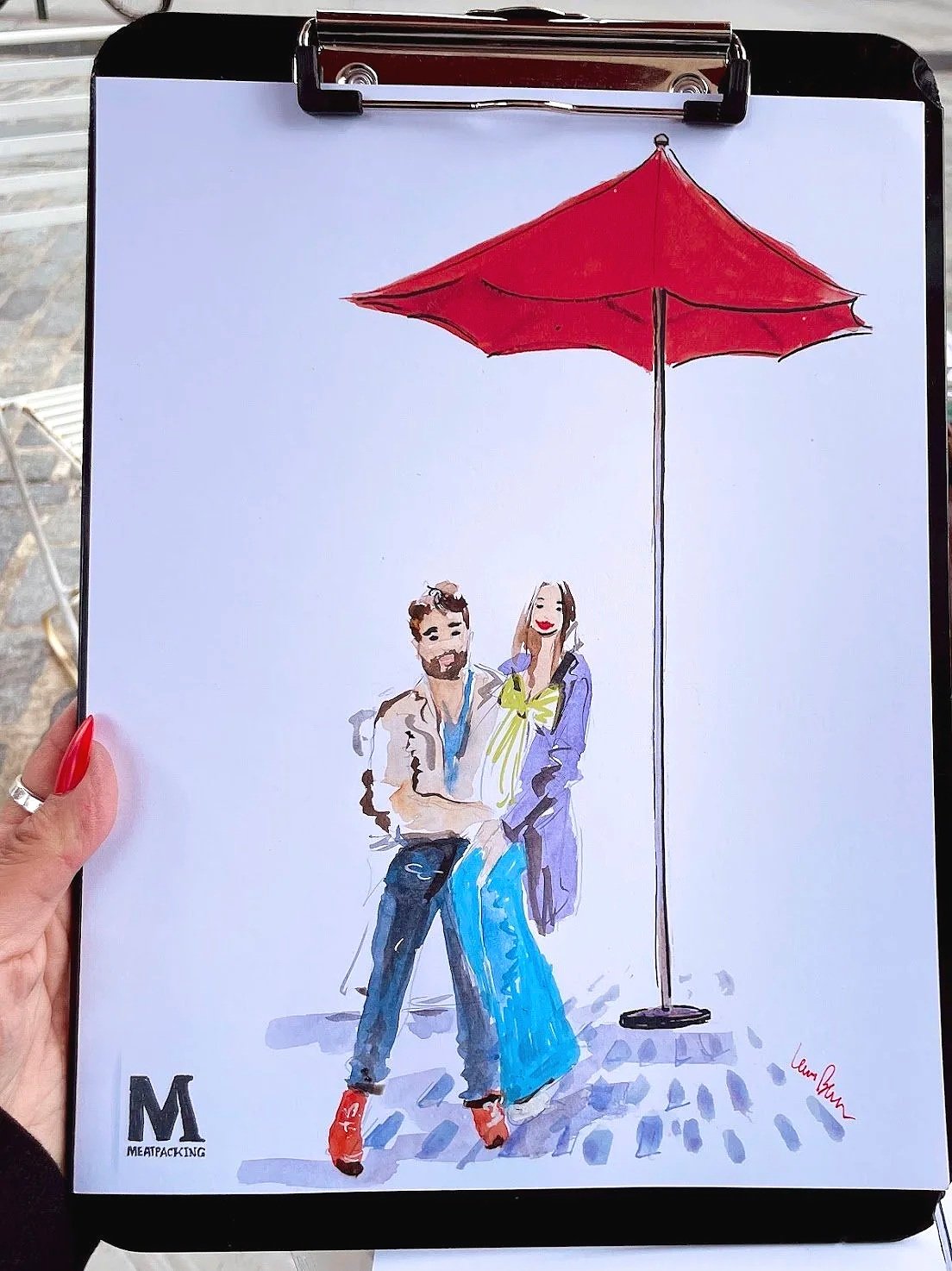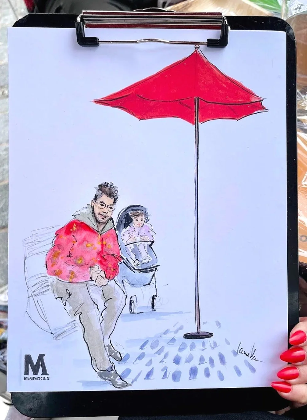 Live sketching fashion illustrations by Laura Baran at Meatpacking’s Return of the Red Umbrellas Event in Gansevoort Plaza, NYC.