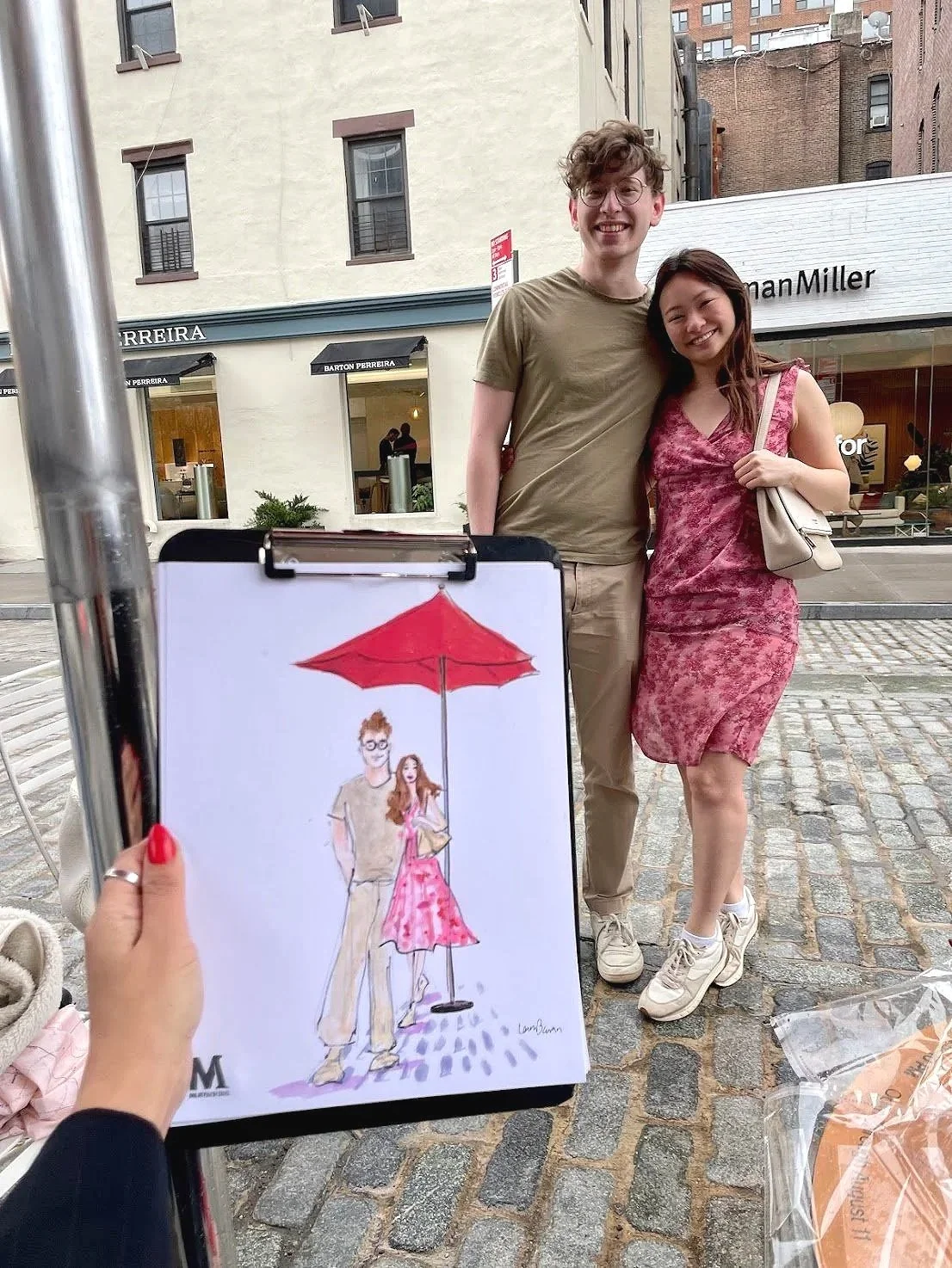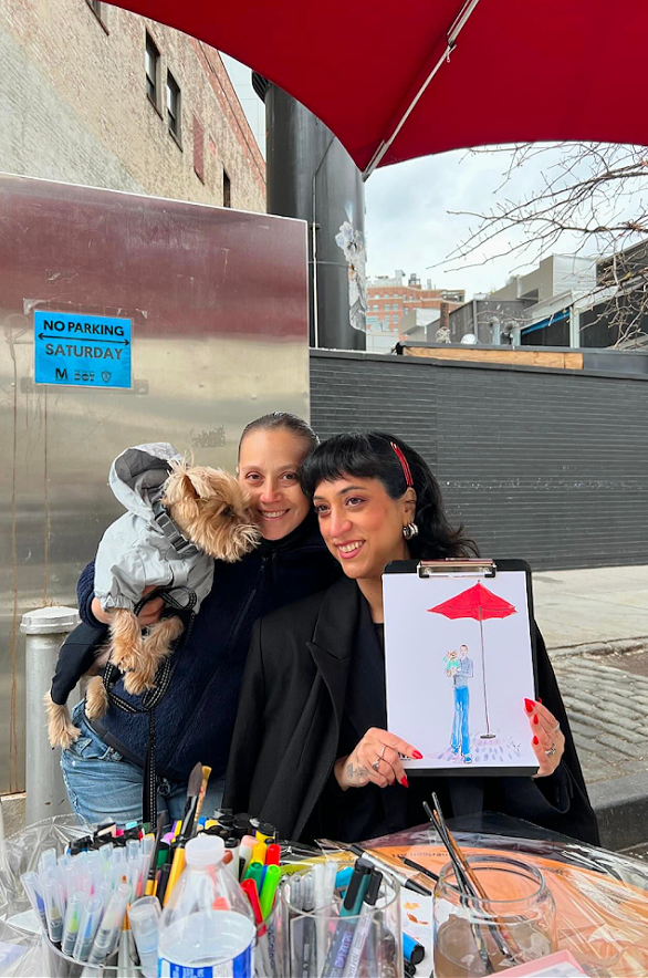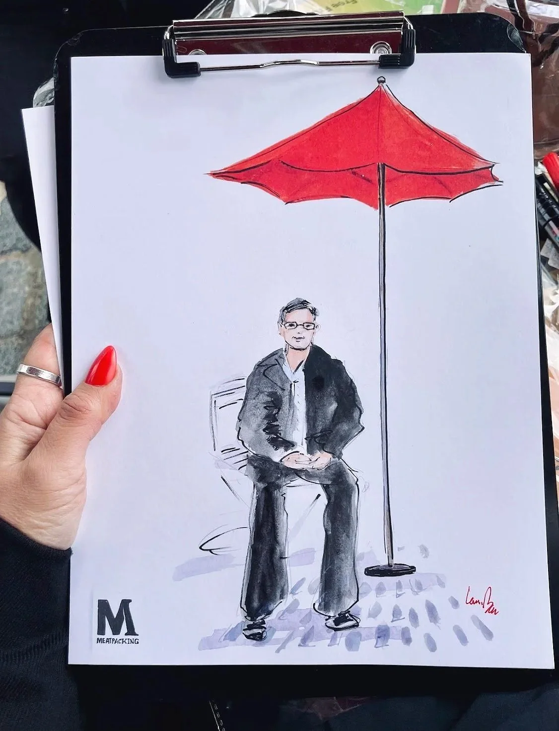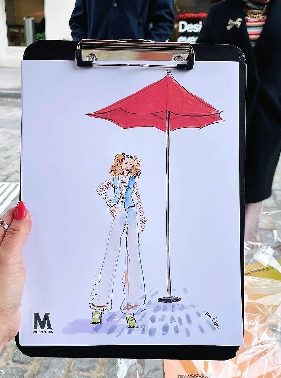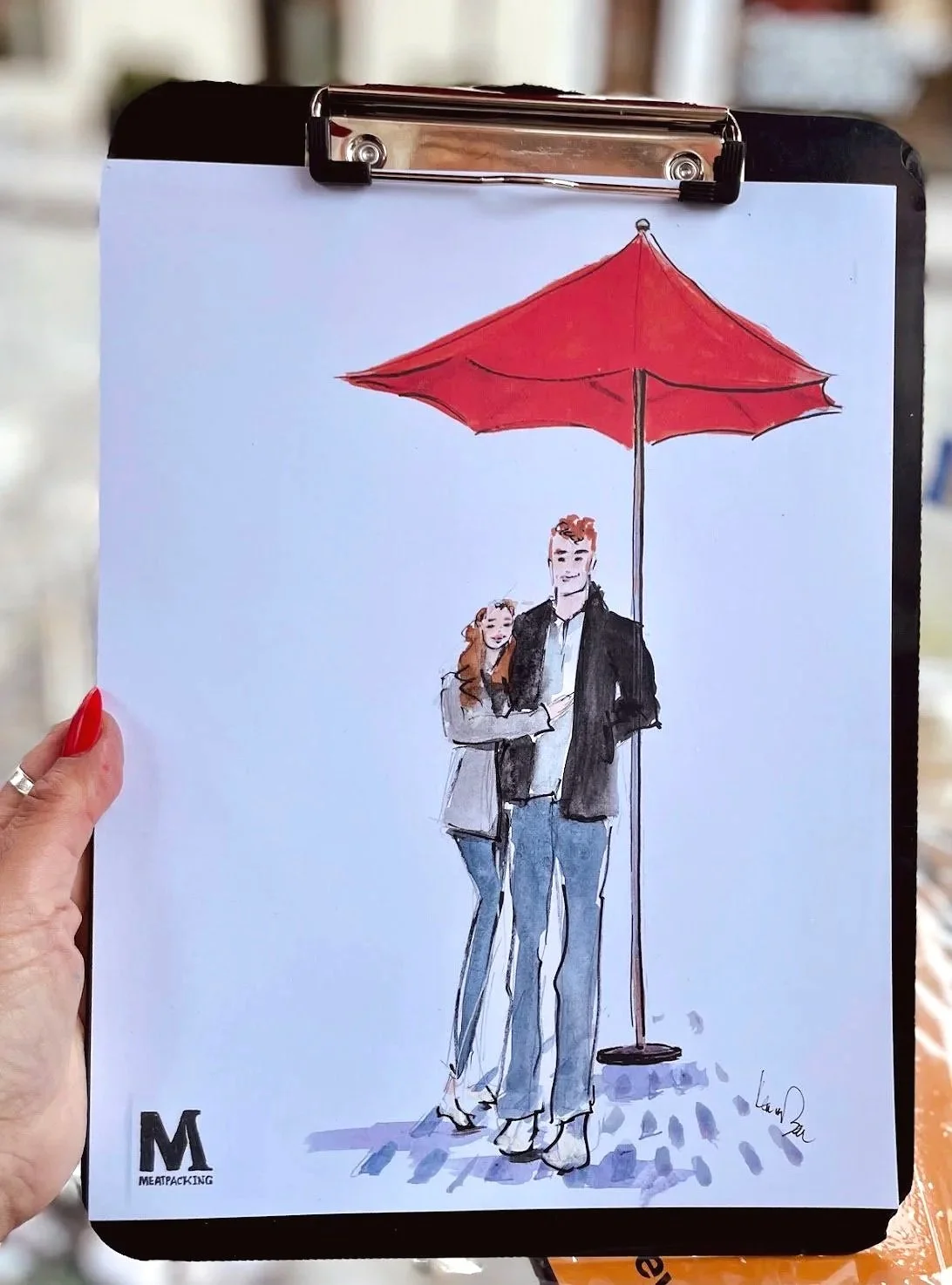 Live sketching fashion illustrations by Laura Baran at Meatpacking’s Return of the Red Umbrellas Event in Gansevoort Plaza, NYC.