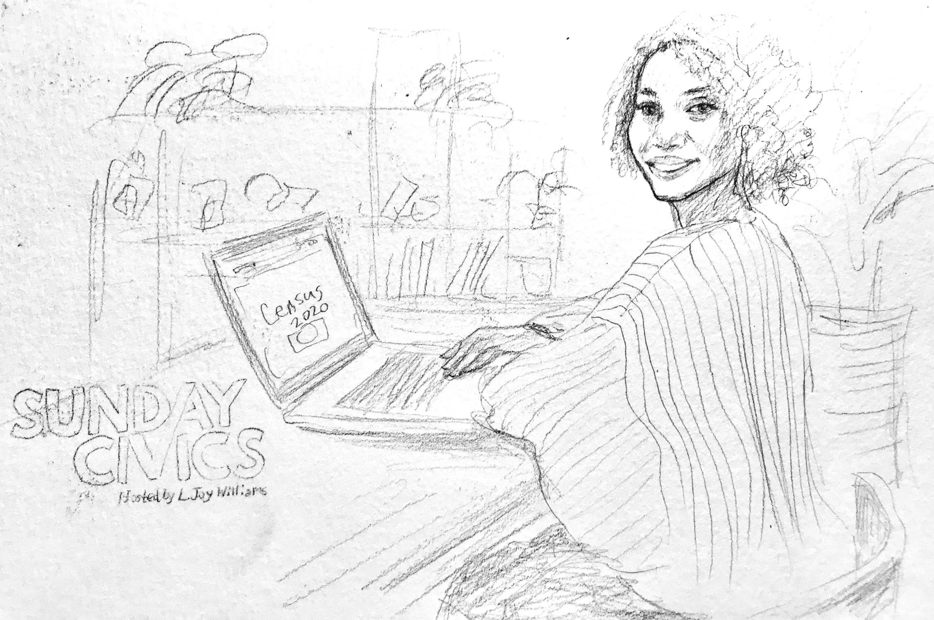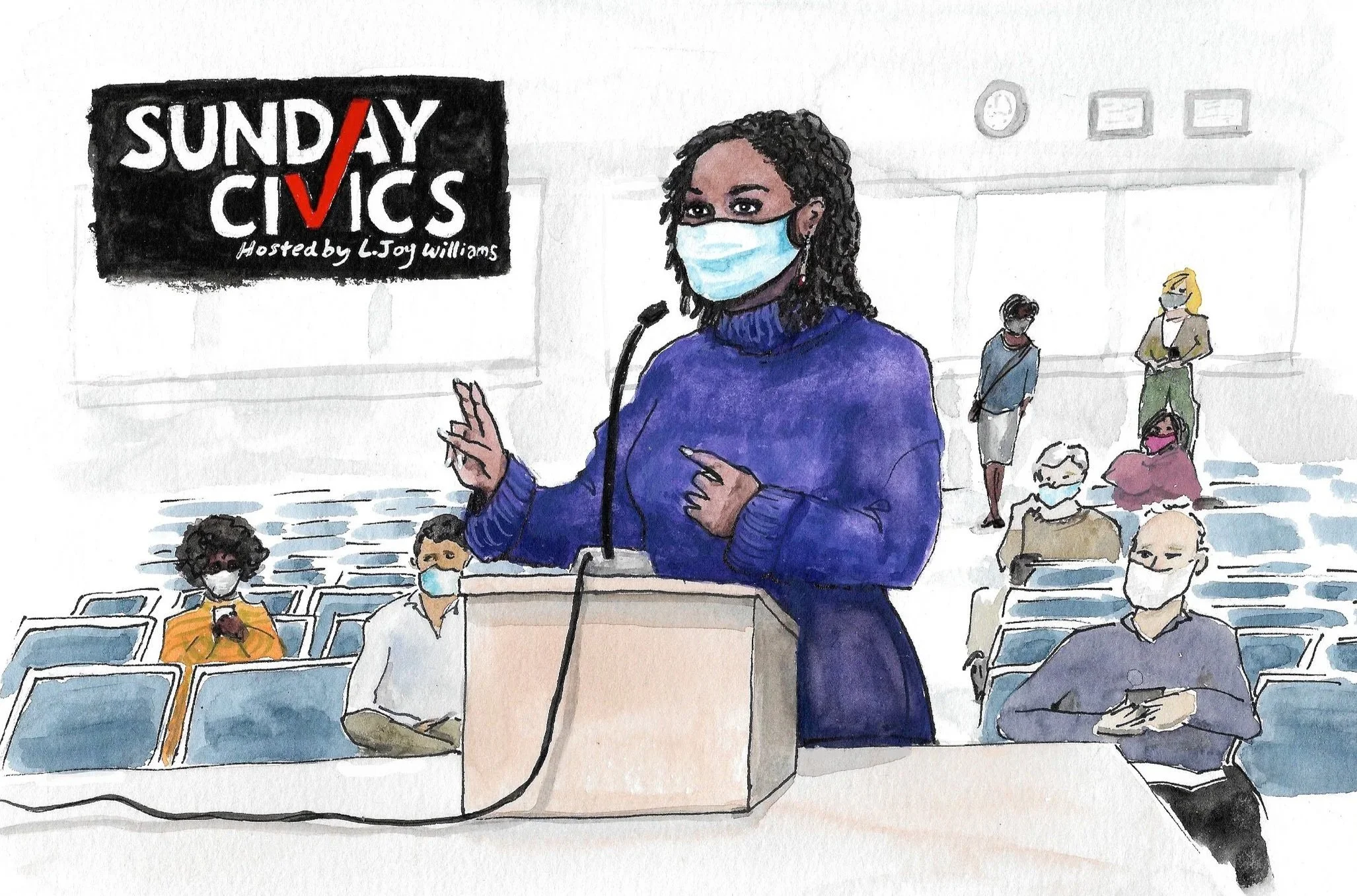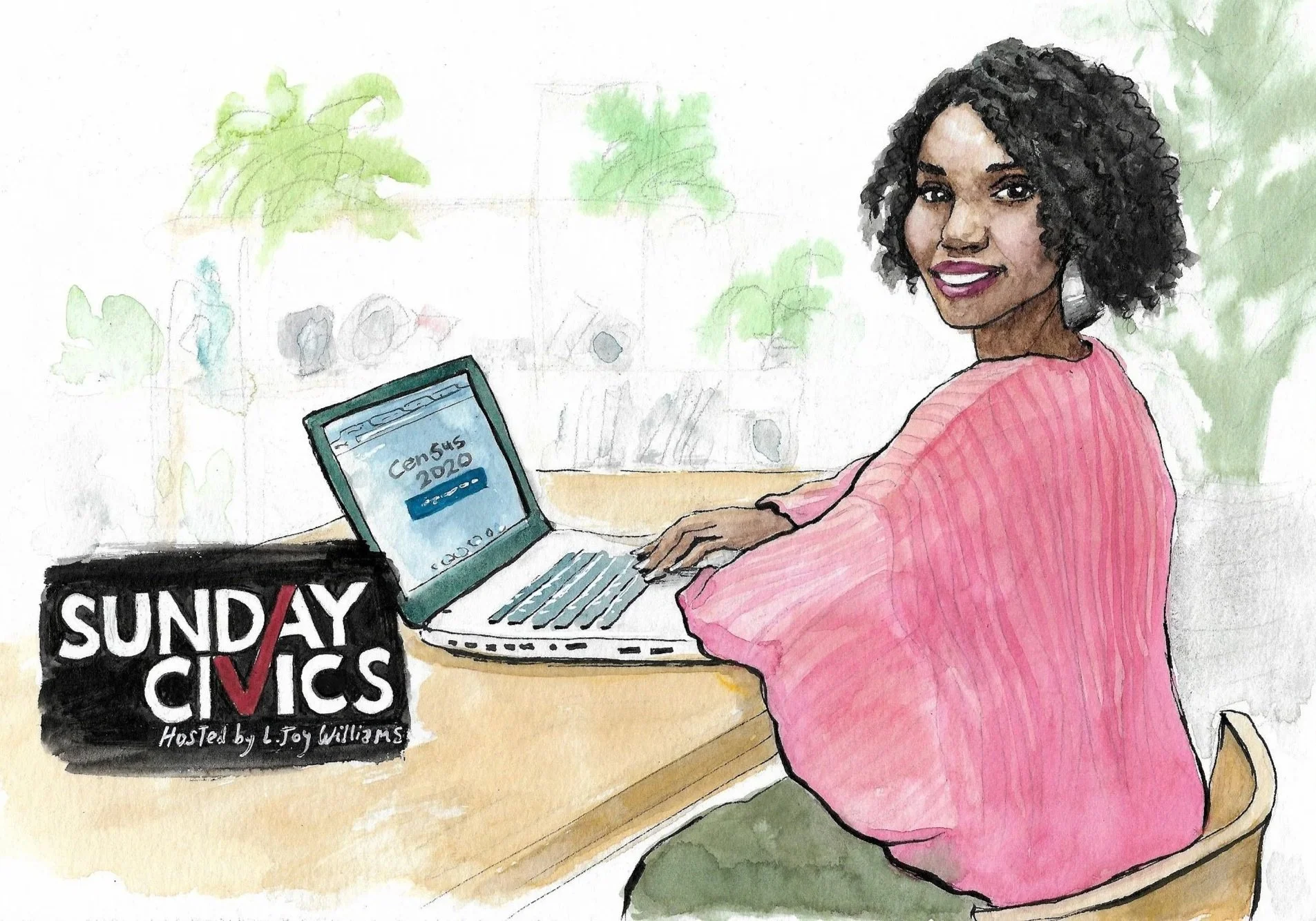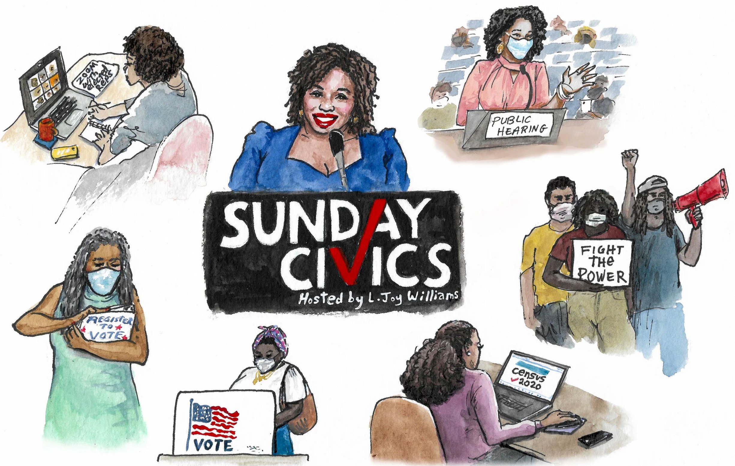 Marketing and promotional illustrations hand-painted by Laura Baran for Sunday Civics on SiriusXM, hosted by L. Joy Williams, 2020.