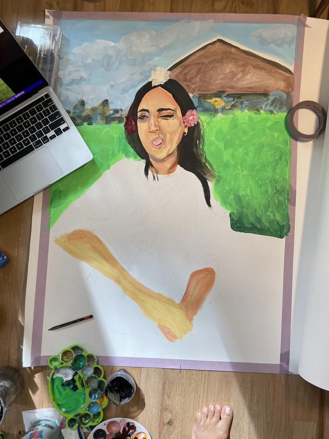 This painting is a call to recognize abortion as the foundation of public health and individual resilience — a visual argument that true creativity and healing can only flourish when we have the right to choose the shape of our own lives. In this self-portrait, I explore the intersection of bodily autonomy and parental legacy, wearing a Monrowe hat designed by Dani Evans and a shirt bearing Chanel Porchia-Albert’s vital reminder: 'Postpartum is Forever.' This is a statement for reproductive freedom, through a self portrait documenting the reality that my current motherhood was made possible only by the essential healthcare of a life-saving abortion two decades prior. People who birth children never get to claim their pre-birth lives back, and forced birth is an atrocity.
