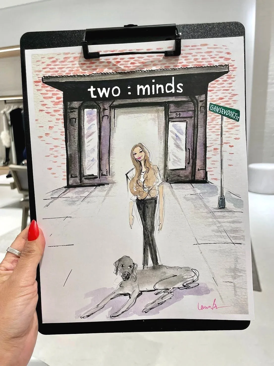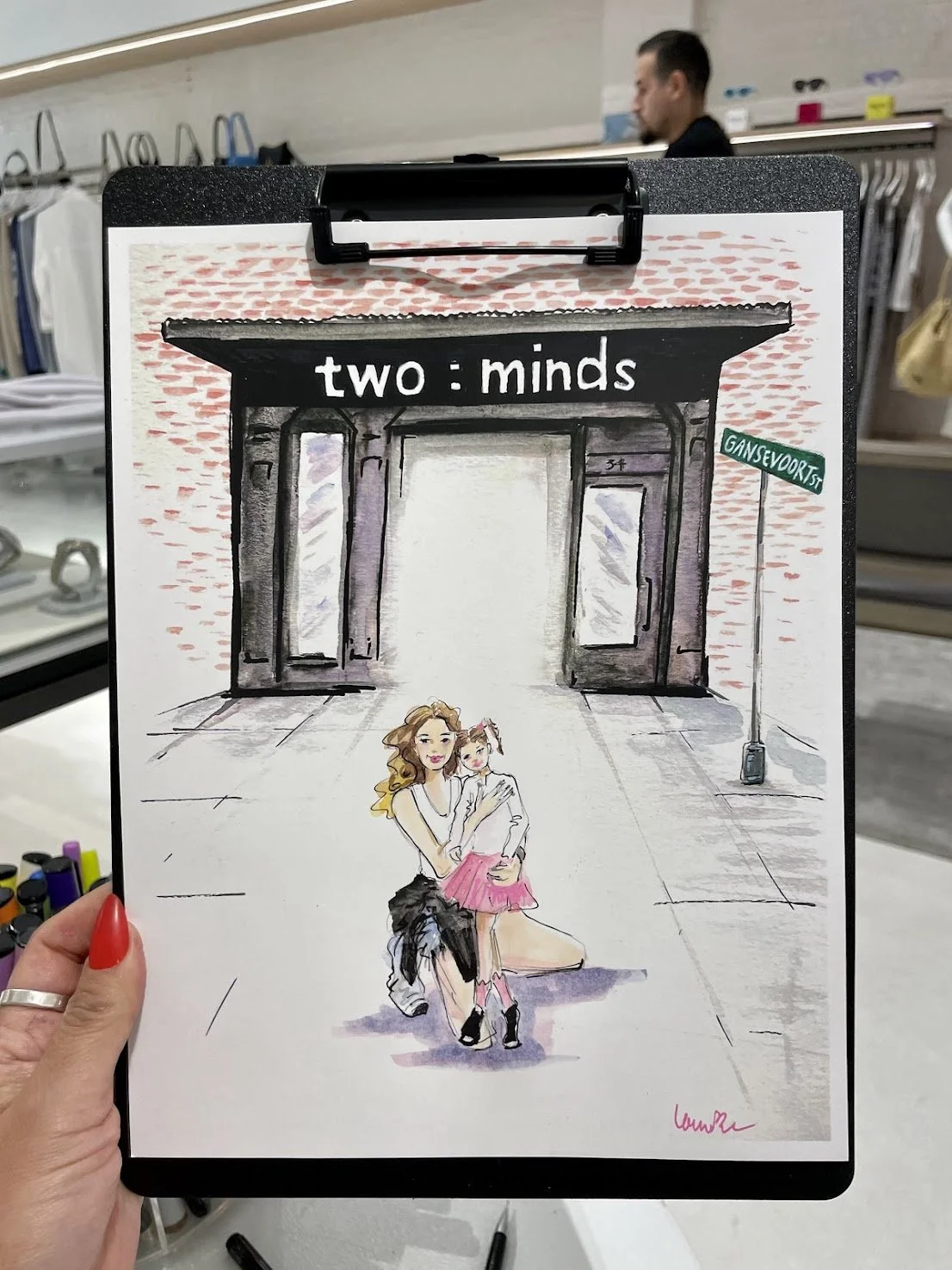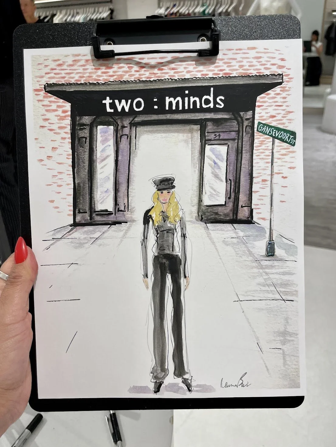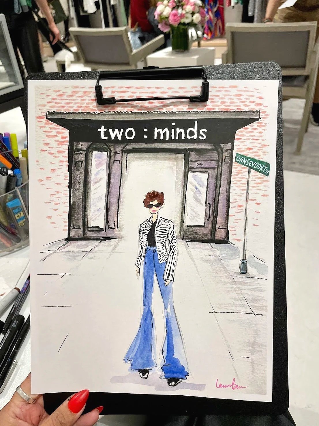 Live sketching fashion illustrations on a custom background by Laura Baran for guests at luxury boutique two : minds NYC’s 3rd year anniversary event in-store on Gansevoort Street, NYC. Apr 28, 2024