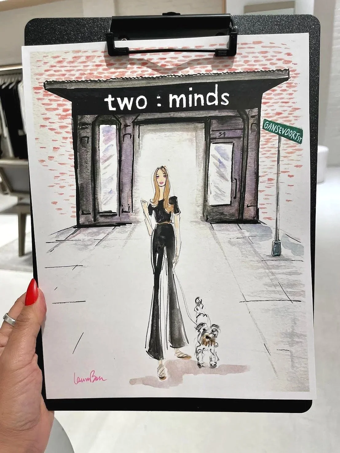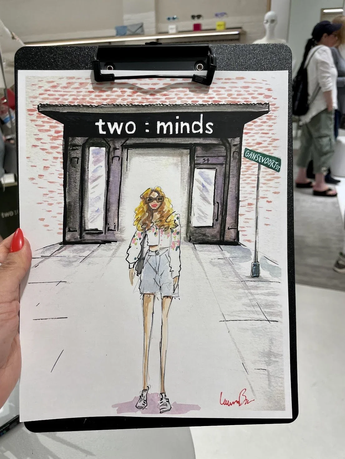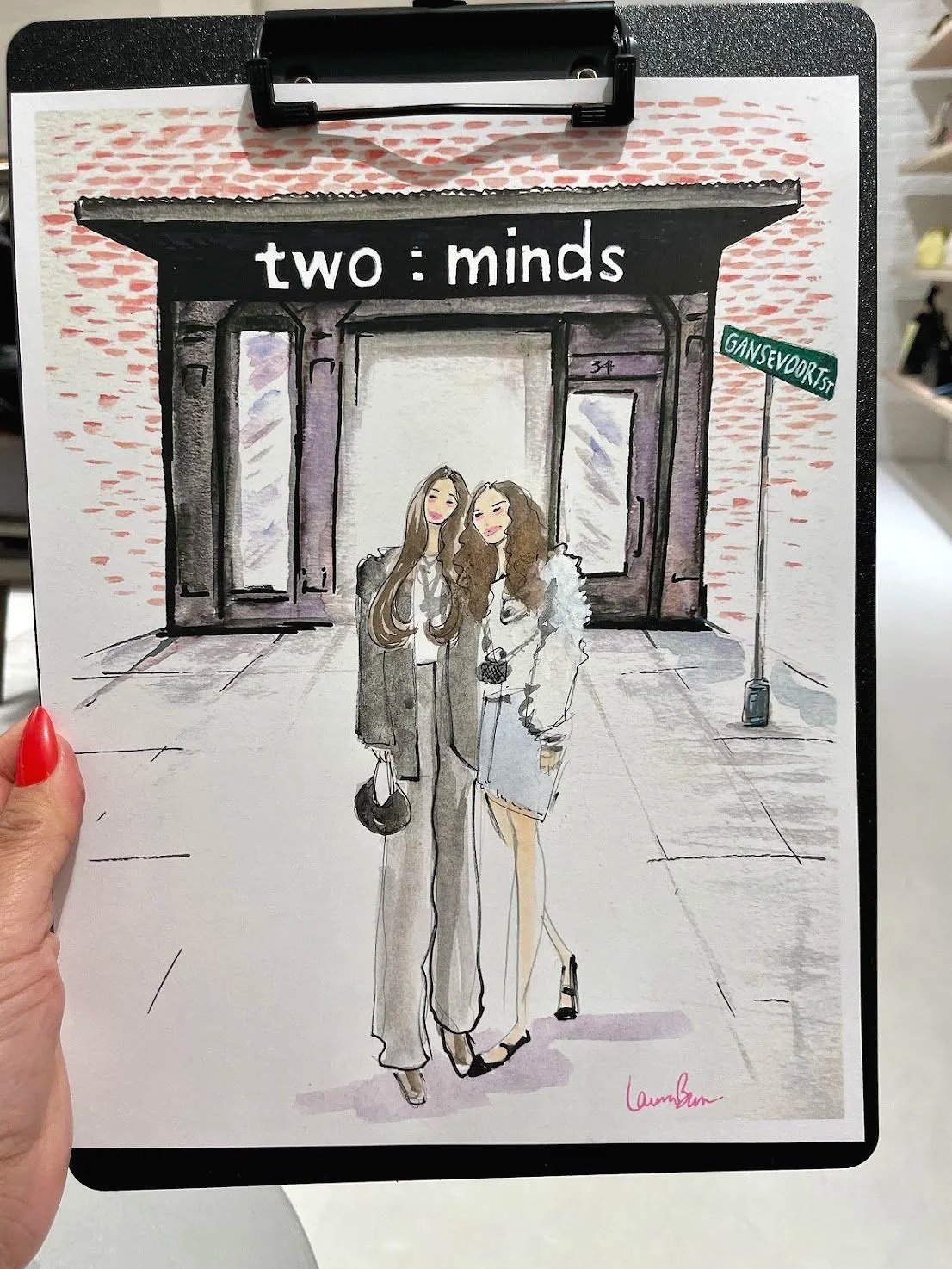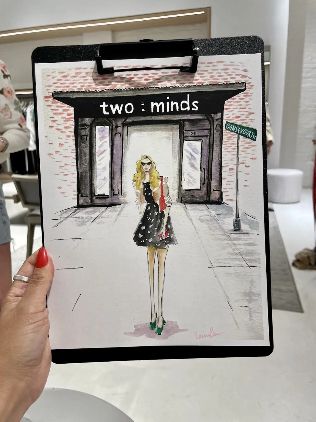 Live sketching fashion illustrations on a custom background by Laura Baran for guests at luxury boutique two : minds NYC’s 3rd year anniversary event in-store on Gansevoort Street, NYC. Apr 28, 2024