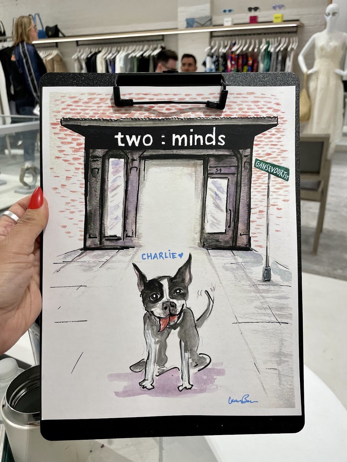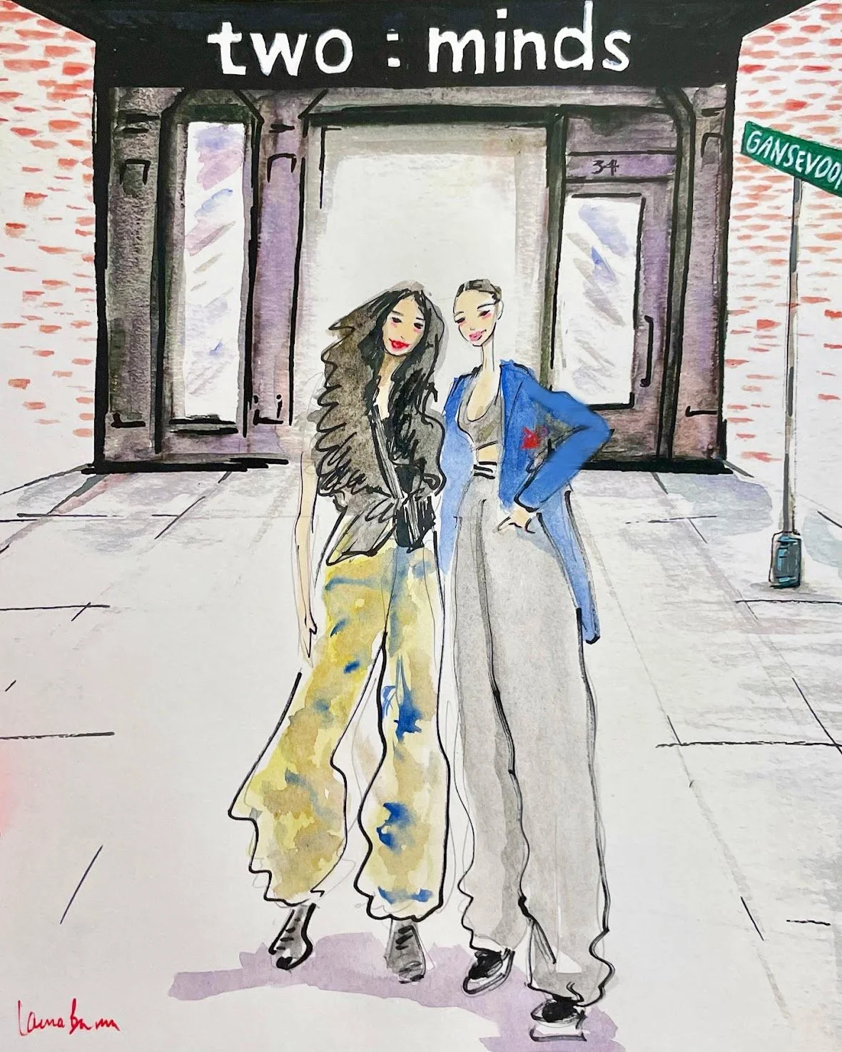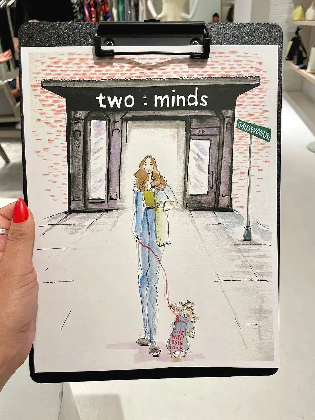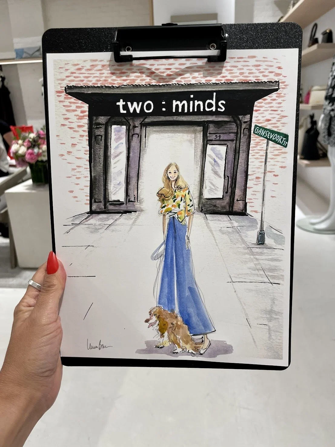 Live sketching fashion illustrations on a custom background by Laura Baran for guests at luxury boutique two : minds NYC’s 3rd year anniversary event in-store on Gansevoort Street, NYC. Apr 28, 2024